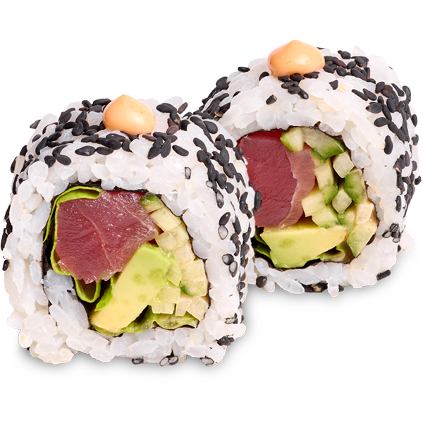 Tunas, avokadas, agurkas, salotos lapas, sezamo sėklos, karai padažas