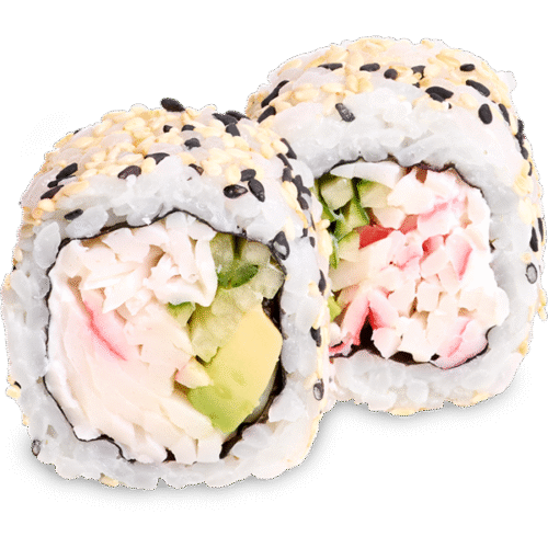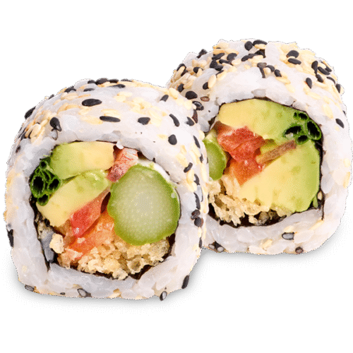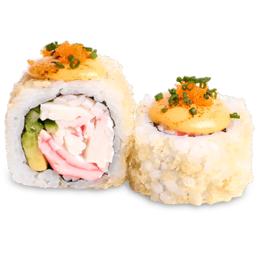 Kepta lašiša, agurkas, kreminis sūris, teriyaki majonezas, masago ikrai, karai padažas