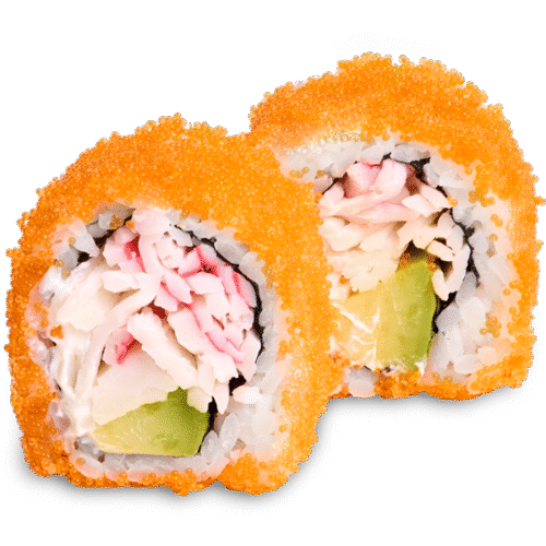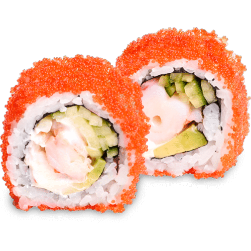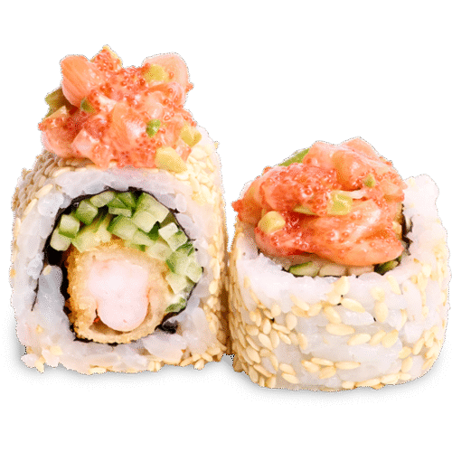Kepta krevetė tempuroje, agurkas, majonezas, sezamo sėklos, chedar sūrio padažas, teriyaki padažas, svogūnų laiškai