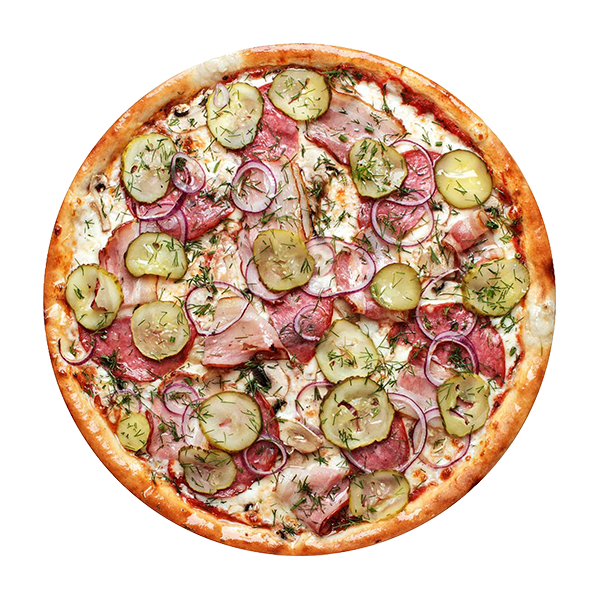 Kvietinių miltų padas, pomidorų padažas, mocarelos sūris, pievagrybiai, kiaulienos šoninė, saliami, marinuoti agurkai, raudonieji svogūnai, krapai, alyvuogių aliejus su česnaku ir žolelėmis.