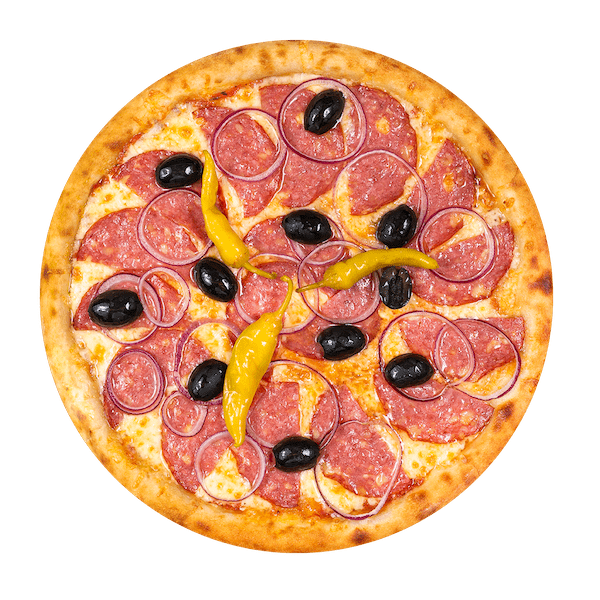 Kvietinių miltų padas, pomidorų padažas, mocarelos sūris, saliamis, raudonieji svogūnai, juodosios alyvuogės, peperoni pipirai, alyvuogių aliejus su česnakais ir žolelėmis